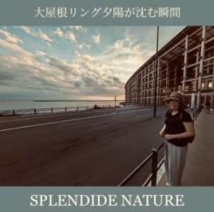 丁度、夕陽が落ちようとしている大屋根リングのカーブと海