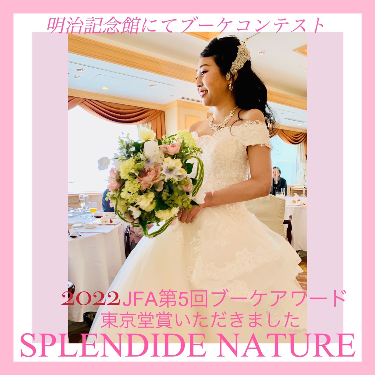 こんにちは🌹みなさん SPLENDIDE NATURE代表の小泉昌代です。 JFA第5回ブーケアワード2022 明治記念館で3/18〜3/23ブーケコンテスト一般投票所が設けられ3/24.明治記念館「芙蓉の間」でフレンチ … 続きを読む JFA第5回ブーケアワード2022
